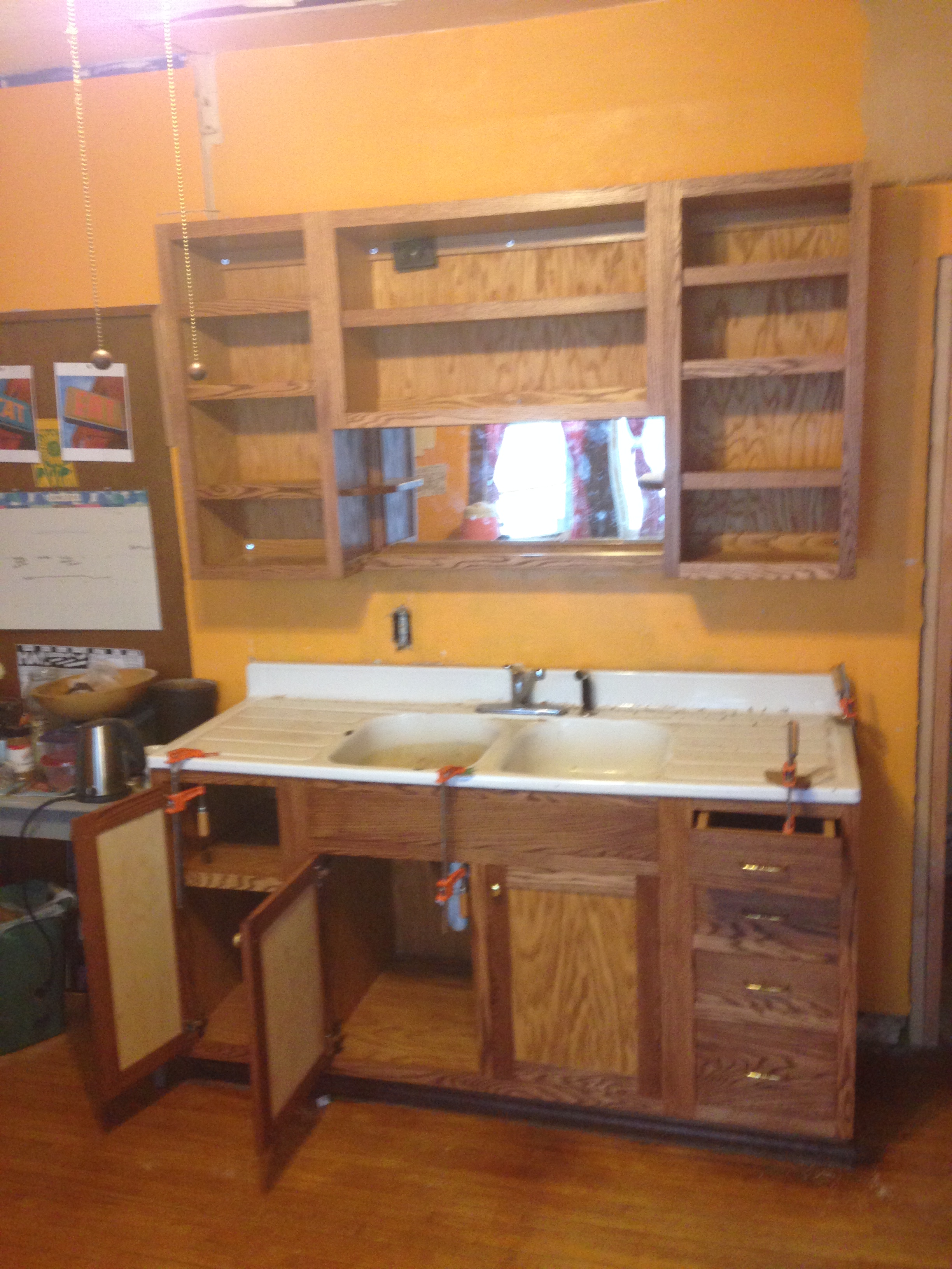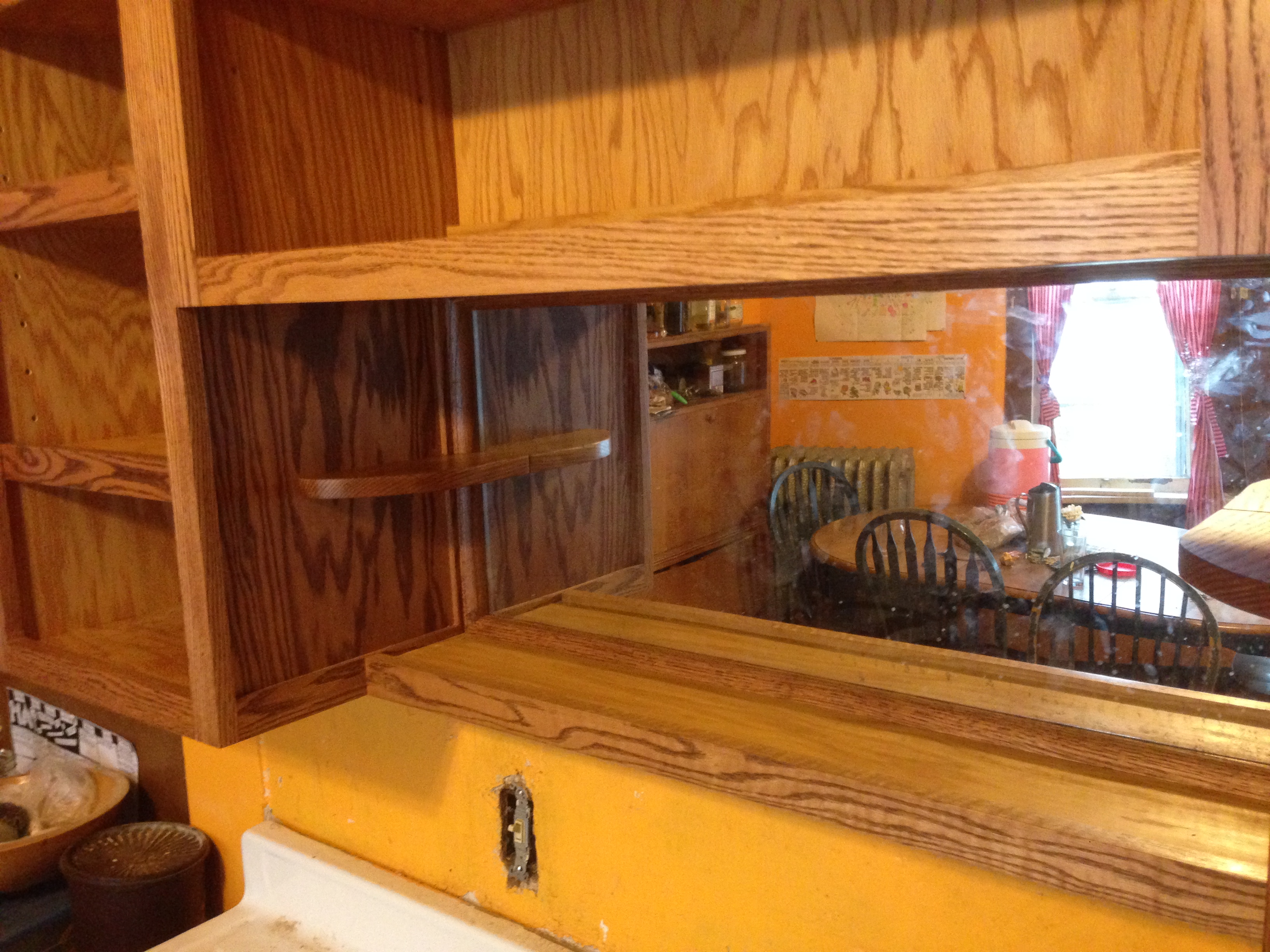 2014-06-11 19.20.56 2014-06-11 19.20.29 2014-06-11 19.20.232-tone stained red oak kitchen. 2 4-foot butcher blocks on either side of the stove. Dovetailed drawers. Mug shelf and mirror over sink.