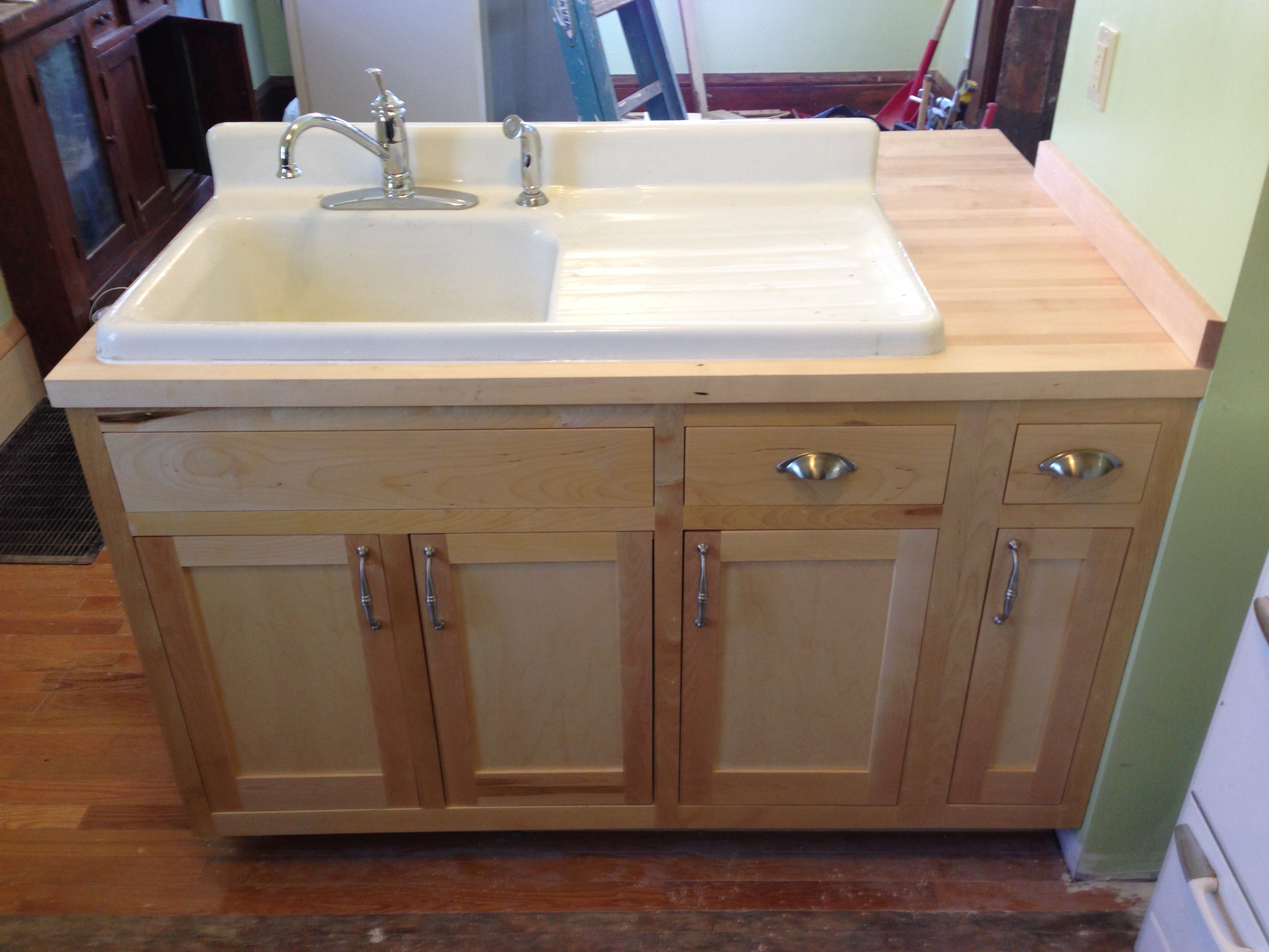Front and back shots of a set of 3 cabinets and counter that we built in january 2013. Inset doors and drawers, solid hard maple butcher block top that extends over the back of the room divider half-wall to provide a small seating area