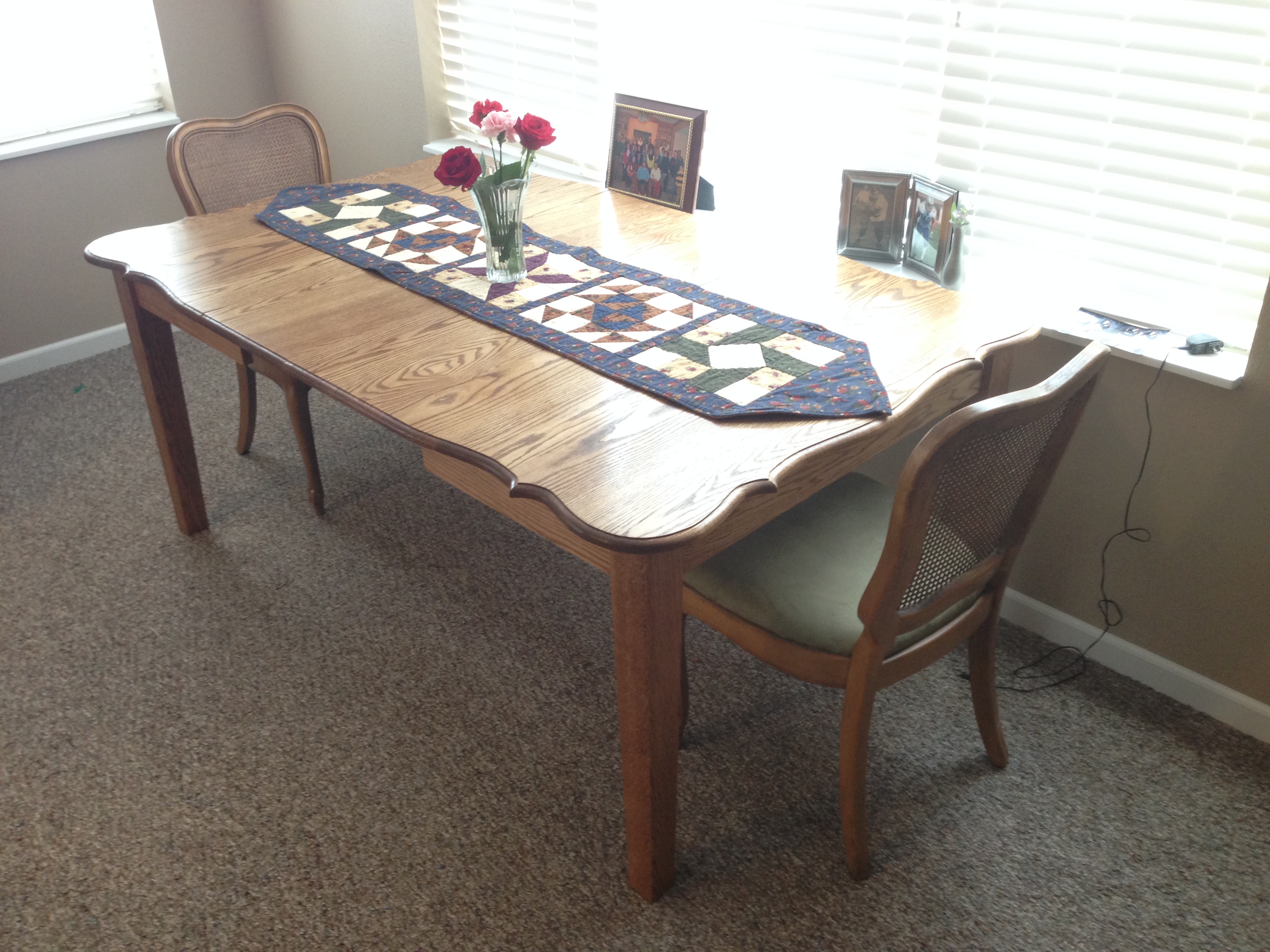 Dining table, red oak with stain. 2 12″ leaves, 48″-72″ total.
