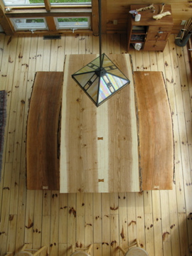 An overhead view of a table and bench set we made in 2012. The top is a pair of bookmatched ash slabs, the benches cherry slabs. We got the slabs from Wood From the Hood, and then surfaced them and built the bases