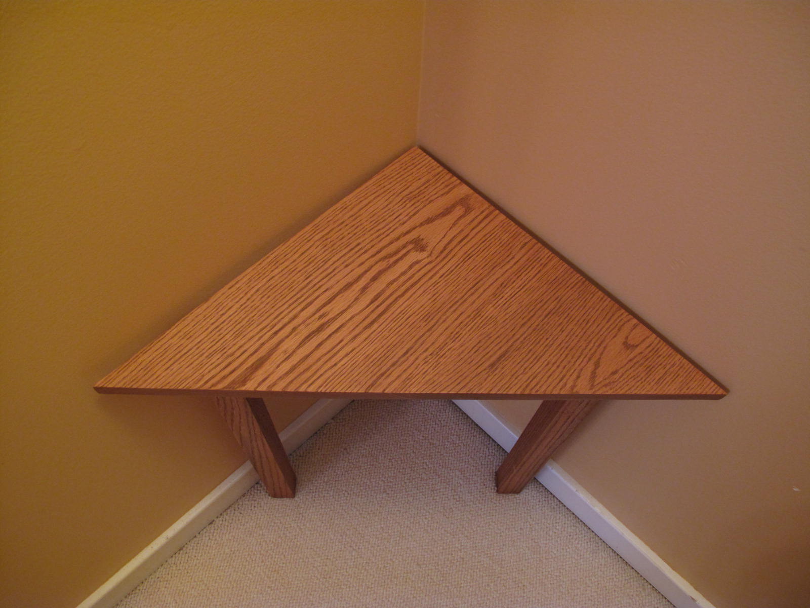 A red oak side table I made in 2010. It uses a t-shaped apron to hold the 3 legs together. It has a light stain to give it the reddish color. There are some oak butterflies set into the top to hold the two pieces together, as well as adding a decorative touch
